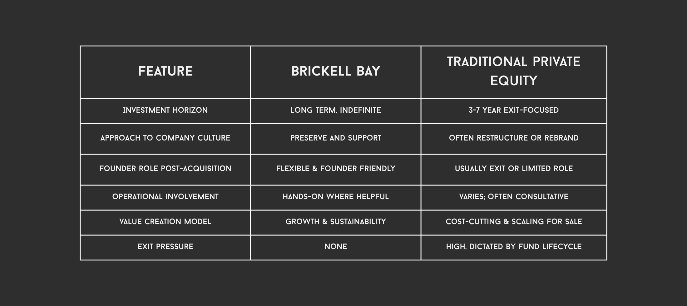 1. Permanent Capital, No Exit Pressure We’re not a traditional PE fund with a fixed exit timeline. We invest with patient capital and a mindset to hold indefinitely.